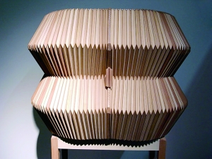 德国设计师Elisa strozyk和艺术家Sebastian neeb合作设计了这款“手风琴书柜”。这件储藏柜外部的薄木片层像手风琴一样被折叠起来。用激光切割的木片手工固定在一个织物(比如莱卡布料)表面上。这两种材料的巧妙结合,让木片表面像布料一样柔软有弹性。手风琴一样的表皮将矩形的柜子包裹起来,不用的时候它就像门一样可以关闭,绝对是个收纳小东西的好帮手。