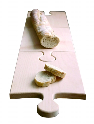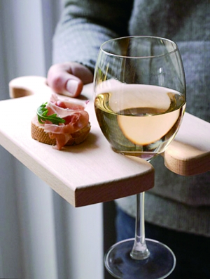 很多人在冷餐会上都会遇到这种情况,一手拿餐盘,一手拿酒杯,这样我们就只能在餐桌附近活动了。而有了这个拼图样式的餐盘,我们就可以把食物直接放在上面,一侧的小孔正好可以用来放高脚杯,搞个寿司芥末葡萄酒什么的,即使在冷餐会上也会显得很从容。更加实用的是,如果食物较多,我们可以把两块拼图拼在一起。而且它是用原木制作的,用来当切菜板也不错。