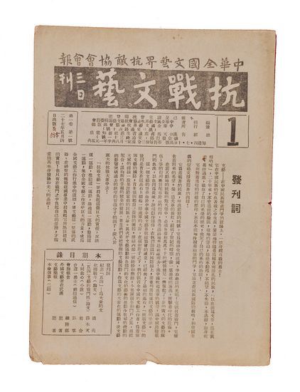 《抗战文艺》 全国文艺界抗敌协会的机关刊物,1938年5月于汉口创刊,1946年5月终刊,共出版78期。该刊编委会由共产党、国民党、无党派人士各占三分之一组成。出版八年期间,始终高举抗战、团结、进步的旗帜,依靠进步作家,吸引并团结大批拥护抗战的文艺工作者,是抗战时期唯一的全国性文艺期刊。