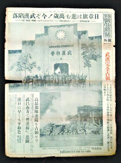 这6件藏品分别是:1938年9月23日在汉出版的《新华日报》、1938年10月武汉卫戍总司令部颁发的《军用证明书》、昭和十三年(1938年)日本出版的《汉口战局全图》、昭和十三年朝日新闻发行的《武汉完全占领》号外(如上图)、抗战时期山西省居住证和昭和十三年日本军方使用军用地图。