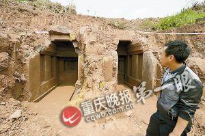 4月13日,北碚区澄江镇十里温泉城还建房小区工地,为打地基,挖掘机和推土机将苦塘湾一座小山推平。“挖到一座坟!”上午10时多,现场施工被叫停,项目经理邓先生上前查看,发现墓室雕刻非常漂亮,遂报告了北碚区文管局。