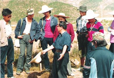 1988年,林向(前中)在四川西昌东坪冶铸遗址发掘工地为川大考古86级考古发掘实习队讲授探方的布方原则。