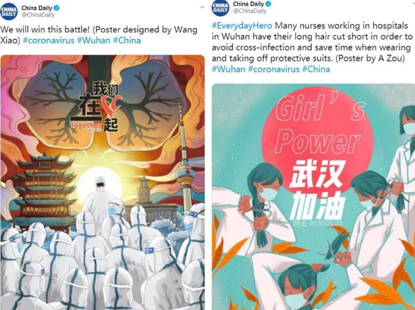 在学界,首都师范大学李中扬教授带领视觉设计与教育研究所和北京设计学会视觉传达设计专业委员会团队,联合《读者》杂志社开展了“爱与希望,终会带来温暖的春天”线上公益海报设计展,择优作品已在《读者》杂志2020年第6期发表;北京化工大学周小儒教授团队倾情创作360余幅抗疫海报作品,网络阅读量累计近300万人次;在疫区以艺术与设计抗疫的湖北美术学院叶佑天教授发起的“蒿目时艰抗疫系列艺术作品网络展”,公众号图文“视觉语态篇”单篇阅读量达1.2万次,为防疫工作的进行和后续防疫储备提供设计参考。