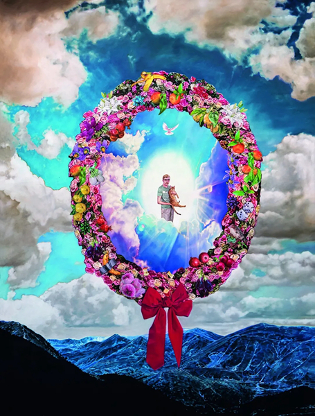作者在艺术实践中,将绘画(作为一种传统媒介)与当代流行文化的意象和数字时代视觉语言的新形式融合成一体。作者一开始运用了云端的拼贴画步骤,通过数字操作、组装拼贴到最后呈现出油画这一传统媒介,创造了复杂的视觉隐喻场景。