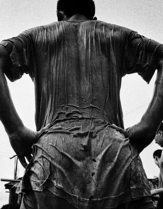1998年7月30日,九江市永修县郭东大堤上,武警战士与洪水搏斗两小时之后的背影。