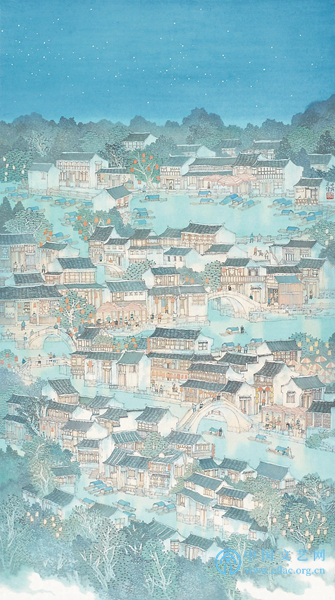 许多作品(尤其是中国画)的构图,既有宏观统摄,又有微观洞察,真是远近高低各不同。但是总体上讲,作品偏于俯瞰式的全景写照。为了显示画面的气势,也为了全面地观照和反映新时代江苏的山河风貌和各种建设场面,这一构图方式的选择似乎在情理之中。