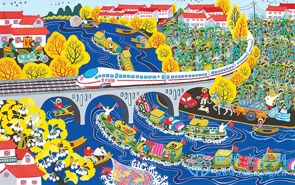 运河两岸展富强(农民画) 76cm×120cm 杨年成