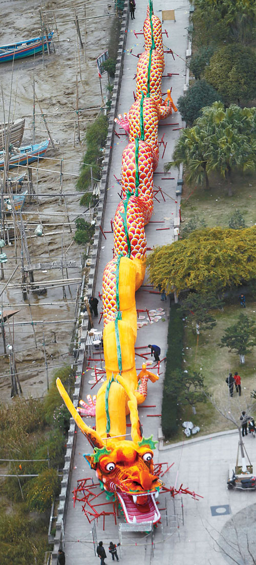 浙江平阳县鳌江镇为迎接农历春节的到来,一条长八十多米的“鳌江大龙”正在加紧制作,并将于农历正月十五正式“飞腾”。鳌江镇的迎龙习俗始于清朝道光年间,至今已有一百七十多年的历史。每三年,当地就会组织一次划大龙活动,祈求风调雨顺、国泰民安。图为一月九日在浙江平阳县鳌江镇拍摄的“鳌江大龙”。新华社发