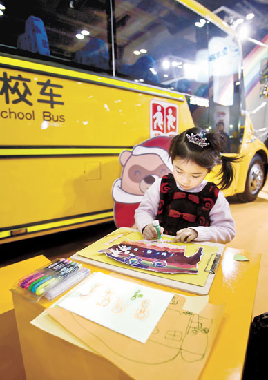 2月15日,一名小朋友在国际校车展览会现场绘制自己心中的校车。当日,为期4天的2012首届中国校车发展研讨会暨国际校车展览会在北京国家会议中心举行,国内外多家汽车厂商展出了新型校车及用于救援救助的特种车辆、用品等。