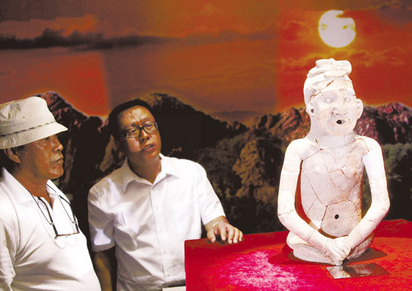 8月20日,北京大学考古文博学院院长赵辉(左)和红山文化整身陶人发掘者、社科院考古研究所研究员刘国祥在观看修复后的红山文化整身陶人。