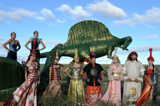8月20日,2012·中国二连浩特中蒙俄民族时装节系列活动之“韵动二连”实景形象摄影活动在内蒙古二连浩特市举行。来自中国、蒙古国和俄罗斯的100多名模特在二连浩特市恐龙地质公园、伊林古驿站等主要标志性景区巡回展示了时装设计师们带来的100多件(套)极具民族特色的时装。图为模特在该活动中展示精美民族服饰。新华社记者 张领 摄