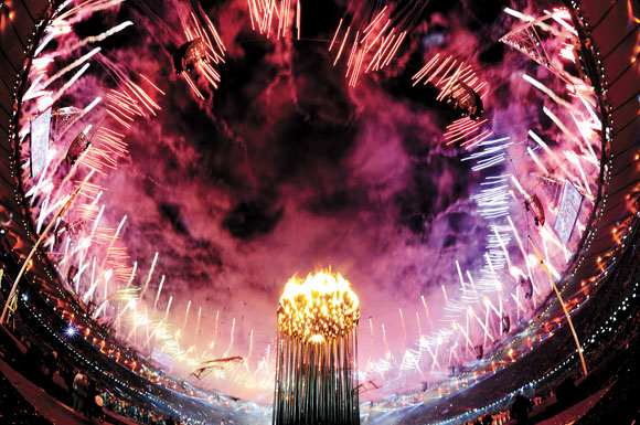 8月29日,2012伦敦残奥会在英国首都伦敦开幕。图为焰火下的残奥圣火。