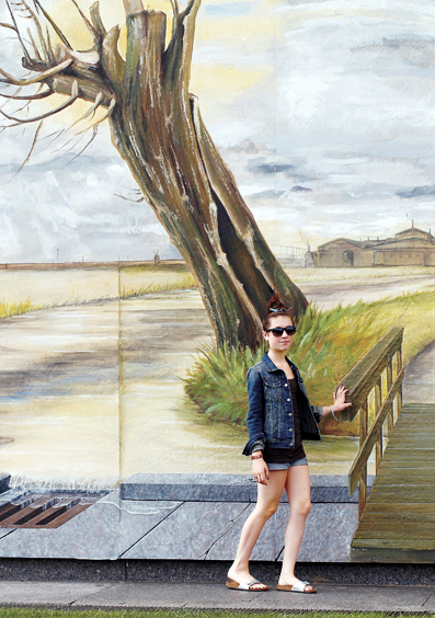8月29日,在荷兰阿姆斯特丹的梵高博物馆,一名游客在3D版的梵高作品《柳树》前留影。新华社发 西尔维亚·莱德尔 摄
