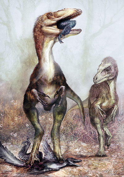 八月三十日,中国与加拿大古生物学者宣布在辽宁省西部义县组地层发现了令人震惊的恐龙胃容物化石,这让人们首次详细了解了带羽毛恐龙到底以何为食。图为中华丽羽龙吞食中国鸟龙。 新华社发 张宗达 绘图