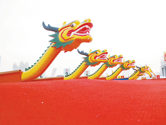 2013中国龙舟公开赛28日在吉林省吉林市开赛。图为在吉林松花江边拍摄的比赛用龙舟。