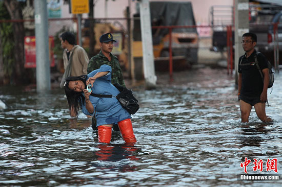 11月12日,洪水进入曼谷城区已有10余天,水势虽缓但仍未退去,有爱好摄影的女孩用了高难度动作在水中拍照。中新社发 余显伦 摄