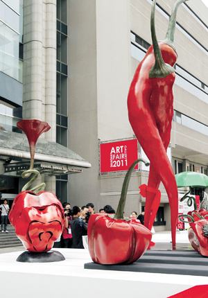 9月13日,2011上海艺术博览会大型主题雕塑《生命探戈》在上海世贸商城门口揭幕。由新加坡观念艺术家库玛丽·纳哈潘(KUMARI NAHAPPAN)创作的这件作品由各种造型的“辣椒”组成,它们在黑白琴键上翩翩起舞,化作一串串音符随风飘扬。新华社记者 任珑 摄
