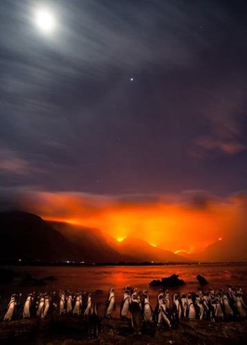 一群非洲企鹅在南非开普敦贝蒂斯湾岸边挤作一团,观望对岸霍屯督-霍兰德山脉山坡上的大火。摄影师:谢姆-康姆皮安。