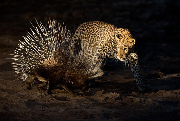 在博茨瓦纳马沙图禁猎区内,一头公豹准备攻击一头豪猪。摄影师:谢姆-康姆皮安。