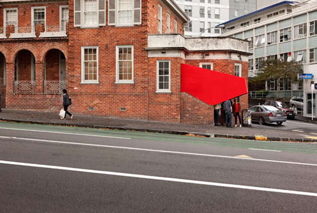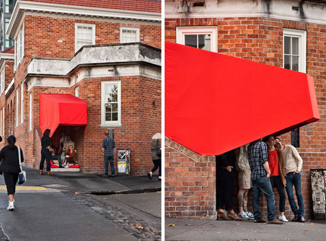 建筑设计团队OH.NO.SUMO在奥克兰的街头设计了一项有趣的公共设备。用一顶醒目的红色顶棚与现有建筑做了个很好的衔接,顶棚里面还可以通过互联网电视观看一些影视短片。这一举动引起了很多市民的关注和围观,这一友好的设计不但可以给候车的路人提供一个歇脚的地方,还能成为三五好友的一个微型聚集地。