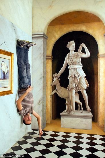 据英国《每日邮报》7月2日消息,越来越多的游览者开始喜欢位于韩国首尔的3D幻觉立体美术馆(Trick Eye Museum),那里收藏了各种主题的三维视觉效果图画。据悉,美术馆展示的作品风格独特,画面中的人物和一些道具经常伸出框架外。观赏者接触这些独具匠心的设计,仿佛“进入”到作品中。