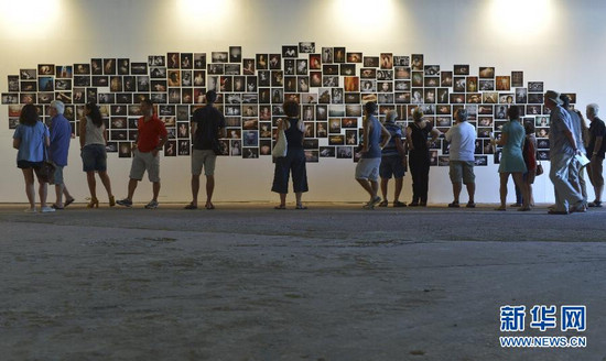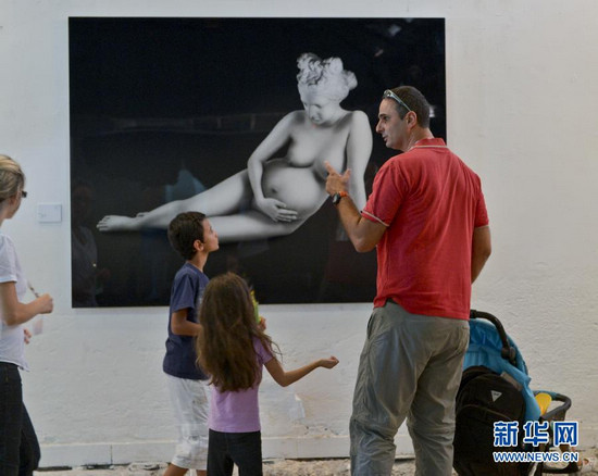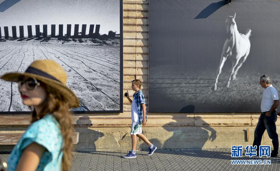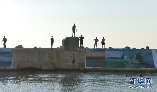 10月7日,在以色列雅法港口举行的国际摄影节上,孩子们从悬挂着摄影展品的防浪堤上跳入海中。第二届雅法国际摄影节于10月2日至8日在以色列的雅法港口举行。以色列国内外的约200名摄影师及30余名策展人参展。 新华社记者尹栋逊摄