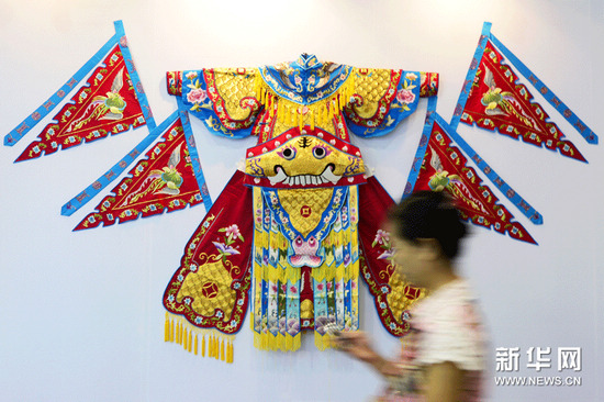 (5)10月9日,观众从一套手工制作的婺剧传统戏服旁走过。