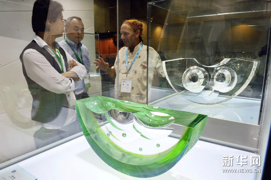 (3)10月9日,美国玻璃艺术大师史蒂芬·温伯格(右)在向观众介绍他的作品。