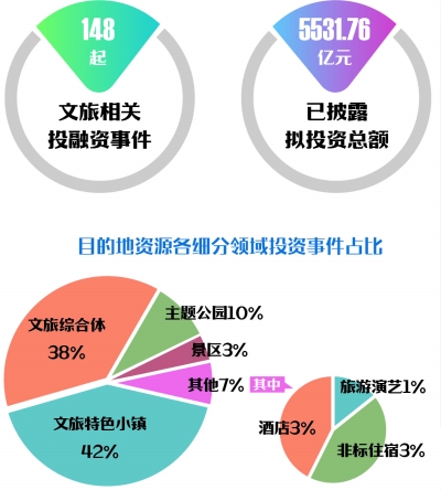 解读:从投融资事件的数量和金额来看,这一领域的主体投向依然是文旅特色小镇和文旅综合体。从投资事件数来看,文旅特色小镇、文旅综合体等综合性文旅项目占比达到82%;从投资金额来看,这类项目投资额达到5329.09亿元,占目的地资源端总投资的97.2%。