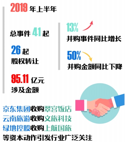 解读:2019年上半年,我们追踪到文旅行业资本运作事件41起。在IPO方面,2019年上半年文旅行业没有企业在相关主板市场上市,在新三板市场,有3家文旅企业挂牌,分别是青岛超逸、绿太阳、曲江制造,同时也有3家企业摘牌,分别是碧螺塔、香堤湾、普峰旅行。