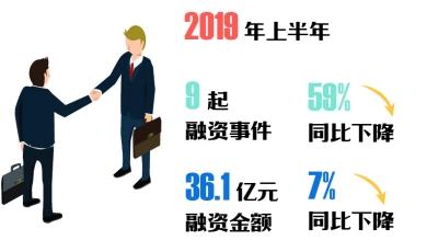 在股权并购方面,与2018年上半年相比,并购事件数量增加了13%,但并购金额下降了50%,说明企业股权并购活跃度有所上升,但并购额度或体量有所下降,其原因之一或是部分企业股权估值有所下降。