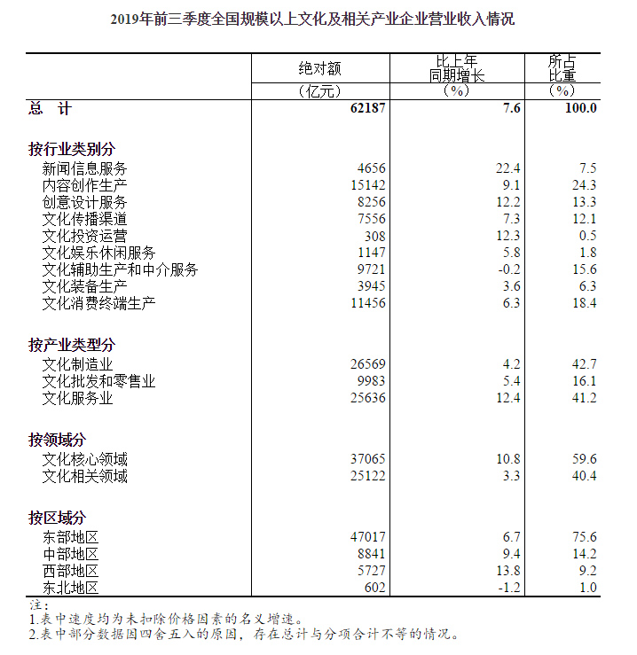 据对全国5.6万家规模以上文化及相关产业企业调查,2019年前三季度,上述企业实现营业收入62187亿元,按可比口径计算(详见附注6)比上年同期增长7.6%[1],总体继续保持平稳较快增长。