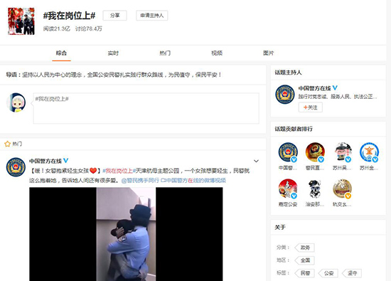 公安部发起的“我在岗位上”活动,在微博上阅读21.3亿,讨论78.4万。