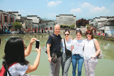 图为外国游客在中国安徽宏村合影。施亚磊摄 (新华社发)