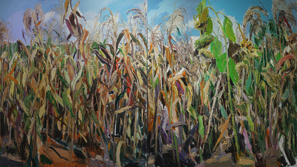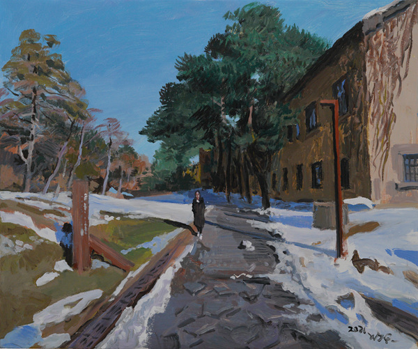王建国持续致力于写意性油画的学理性实践与创作,以中华美学精神为底色,借鉴表现主义油画语言,在对自然真切的感动中,深刻描绘与刻画其神貌。他的作品主要展现出两个维度的特征:一方面,它是对中国东北地域广袤原野、恢宏大地的诗意抒写。王建国用画笔勾勒着生态文明建设中大地景观的美好图像,作品中既有开阔宏大的原野,四季更迭的长白景色,又有咫尺之间富于生命力的作物,郊外盛放的葵花,强烈的色彩与流动的笔触碰撞交响,颂扬着黑土地的恩泽与丰饶的生命景象,传达出“生生观”的精神写照,抒发着艺术家对家国故土的无限深情;另一方面,通过视觉的描绘,诠释出当代人在都市化进程中微观的内在变化,唤醒潜藏于城市景观中的时光记忆与人文精神。他的作品光色交融、生机勃勃,笔触刹那间的飞动,仿佛流星划过,留下的速度之痕,则是艺术灵感与激情的交汇。天生饱含色彩敏感和乐感,且重情重义的王建国常常在自由挥写、涂抹的过程中妙笔生花。他的色调在鲜亮中沐浴着阳光,他的用笔在奔放中可见精微,在似乎不经意的偶然中带出了形神之妙。