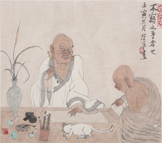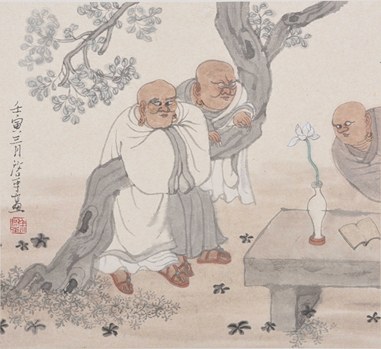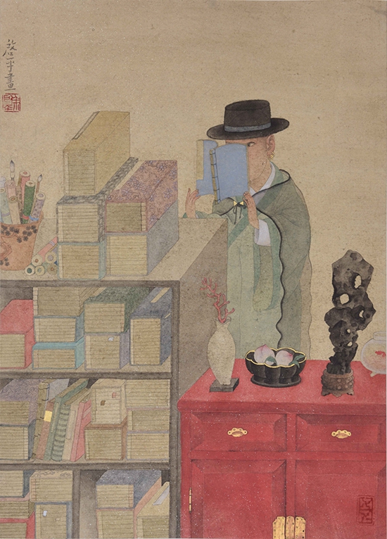 余启平的绘画好就好在似真如幻,并不‘真实’的图像及其人物上,那种憨态、那般狡黠、那股迷离、那番入定,假作真时真亦假,入乎其内,披图入情;出乎其外,观其高致。一半痴迷一半间离,捉迷藏一般捉摸不定,有如看着余老师戴着红色时尚镜架的含笑的脸靥一半是学者的深沉一半是艺术家的幽默,其实内里根本的是一半是海水,一半是火焰。