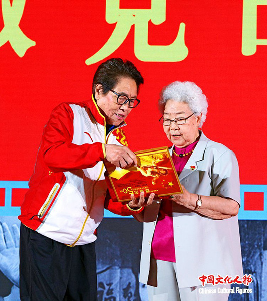 文化部原常务副部长高占祥向著名表演艺术家田华赠送自己的书法作品《国宝》表达自己的敬意