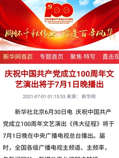 庆祝中国共产党成立100周年文艺演出将于7月1日晚播出