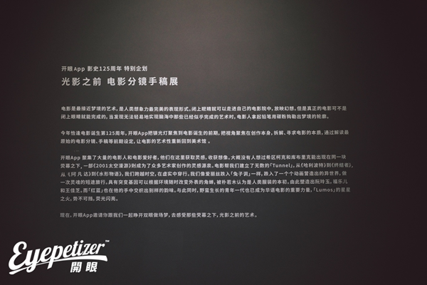 本次展览,开眼App精心收集国内外知名导演作品,力图让观众在四个不同主题展厅深入了解电影艺术的魅力所在。