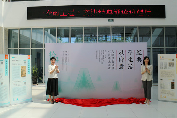 与会人员为“经典,予生活以诗意——文津经典诵读十周年主题展”揭幕