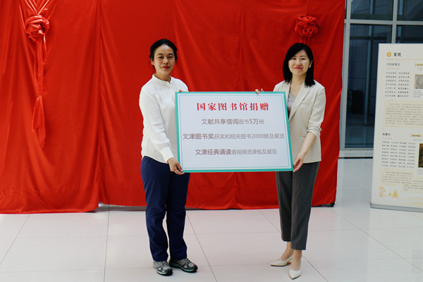 捐赠仪式上,国家图书馆副馆长霍瑞娟代表国家图书馆向新疆地区图书馆捐赠重要文献资源,包括文献共享借阅项目图书5万册、文津图书奖获奖及相关图书2000余册,文津经典诵读项目音视频资源以及相关展览资源等。随后,与会人员为“经典,予生活以诗意——文津经典诵读十周年主题展”揭幕并共同参观。