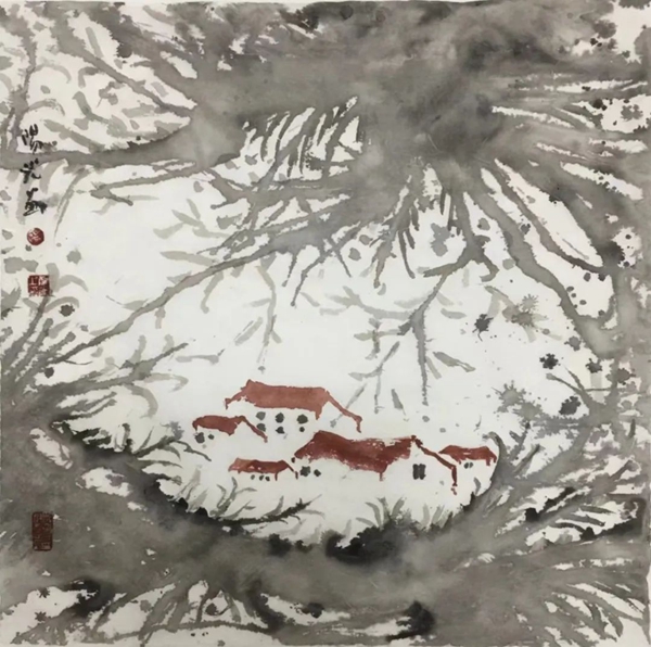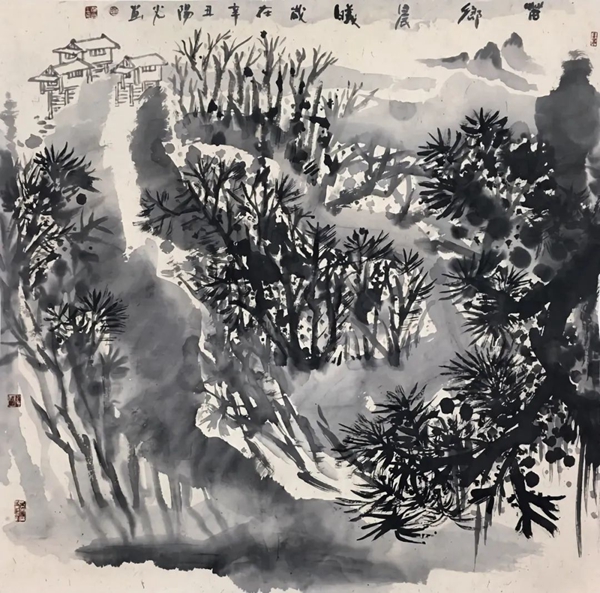 《苗乡晨曦》 纸本水墨 98cm×98cm 2021年
