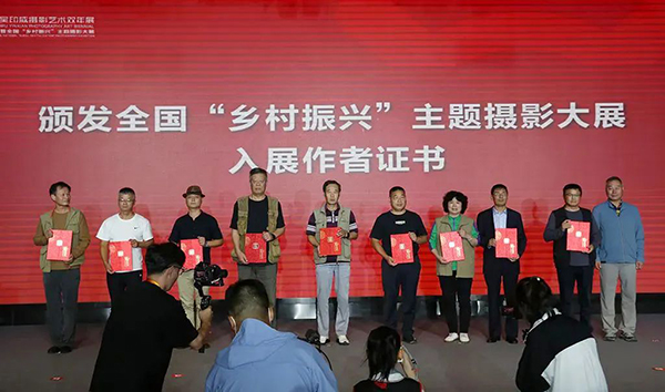 中国摄协副主席杨越峦(右一)为全国“乡村振兴”主题摄影大展入展摄影师代表颁发入展证书