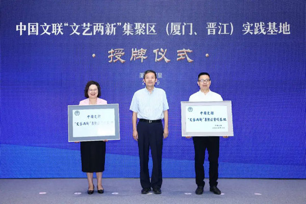 仪式上,中国文联国内联络部分别与厦门市文联、晋江市文联签署《中国文联“文艺两新”集聚区实践基地·厦门市海丝艺术品中心合作备忘录》《中国文联“文艺两新”集聚区实践基地·晋江市五店市传统街区合作备忘录》。诸迪分别为厦门基地、晋江基地授牌。