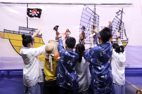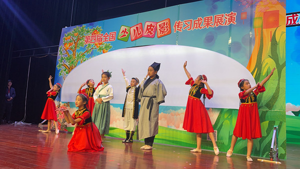 第四届全国少儿皮影传习成果展演活动现场,学生皮影戏演出中