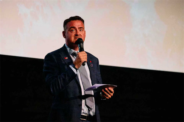 Anthony Jones, chairman of the Lisbon Maru Memorial Association, speaks at the premiere. (Photo/Yang Haopeng)