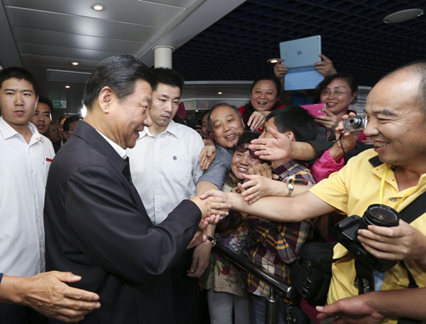 2014年11月1日上午,习近平总书记在平潭海峡高速客运码头登上“海峡号”客轮与赴台的两岸旅客握手交流。
