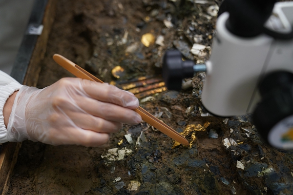 △三星堆博物馆文物保护修复馆内,三星堆文物修复人员正在对出土文物进行清理。(总台国广记者李晋拍摄)
