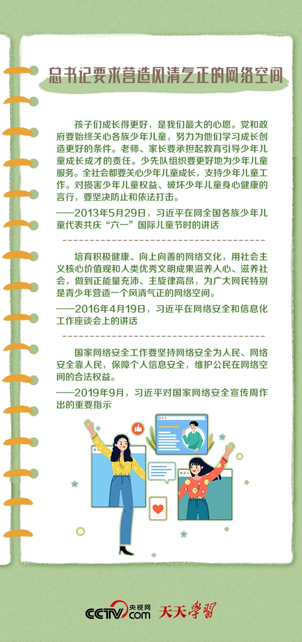 天天学习 习近平总书记曾强调,当代中国少年儿童既是实现第一个百年奋斗目标的经历者、见证者,更是实现第二个百年奋斗目标、建设社会主义现代化强国的生力军。新时代青少年是互联网的“原住民”,伴随互联网一同成长,网络文化对青少年的影响直接而深刻。在网络空间为青少年打造一方晴空,是未成年人保护的题中应有之义。