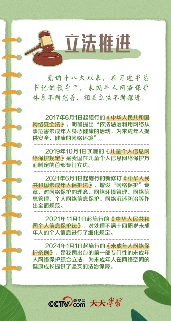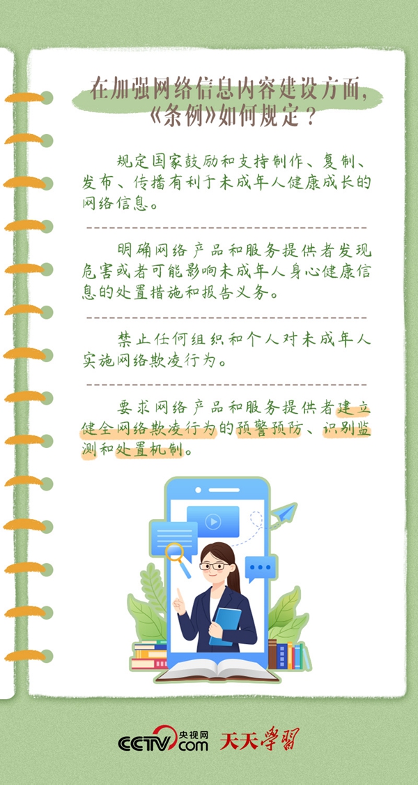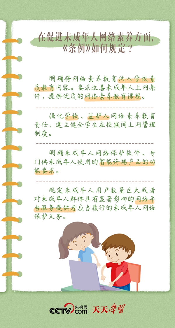 10月24日,国务院公布《未成年人网络保护条例》,该条例将于2024年1月1日起施行。织密法网,呵护成长。央视网《天天学习》围绕习近平总书记关于未成年人保护工作的重要指示批示精神,为您解读条例细则。